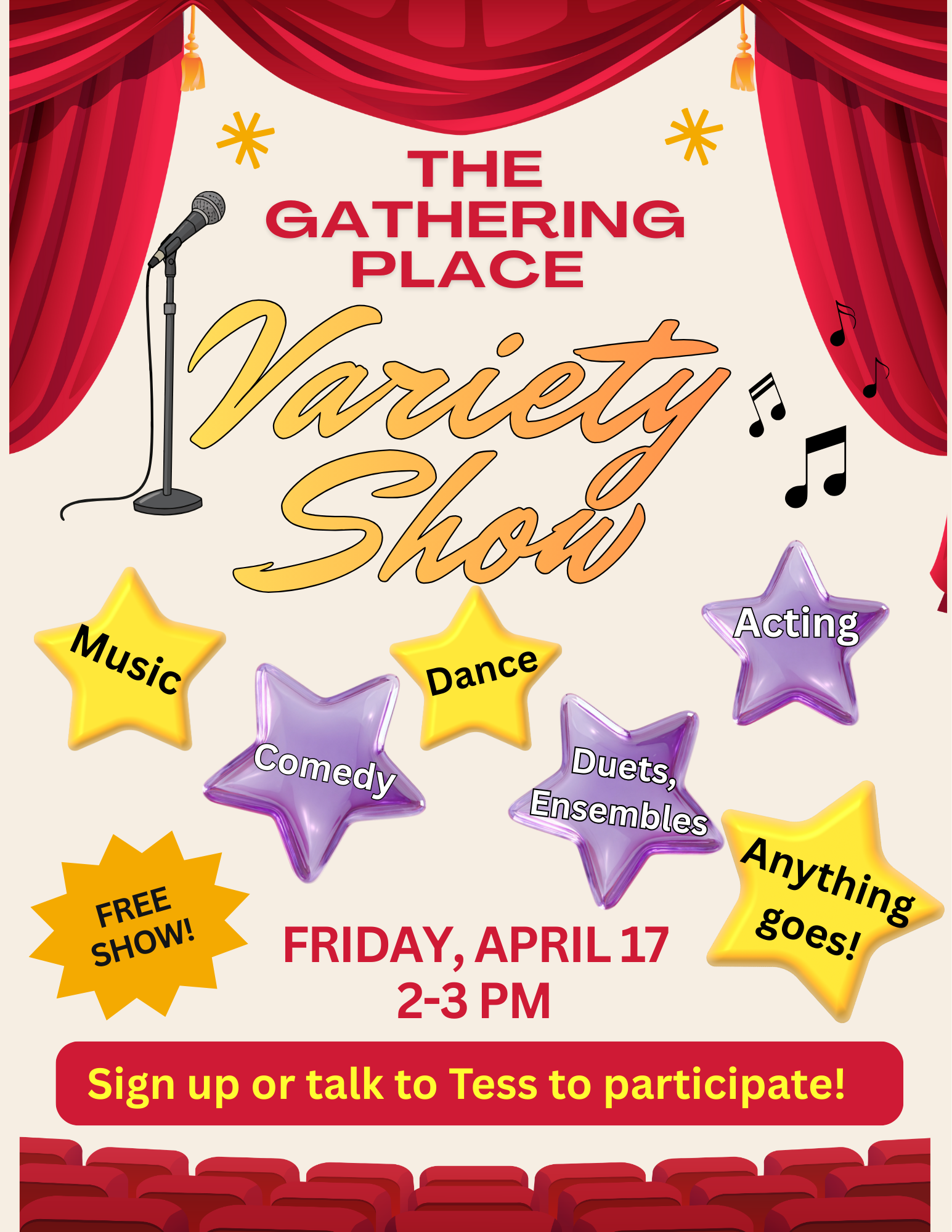 Senior Variety Show Friday, April 17, 2026 2:00 PM 3:00 PM The Gathering Place 715 Campus Street Milton, WI, 53563 United States (map) Google Calendar ICS
