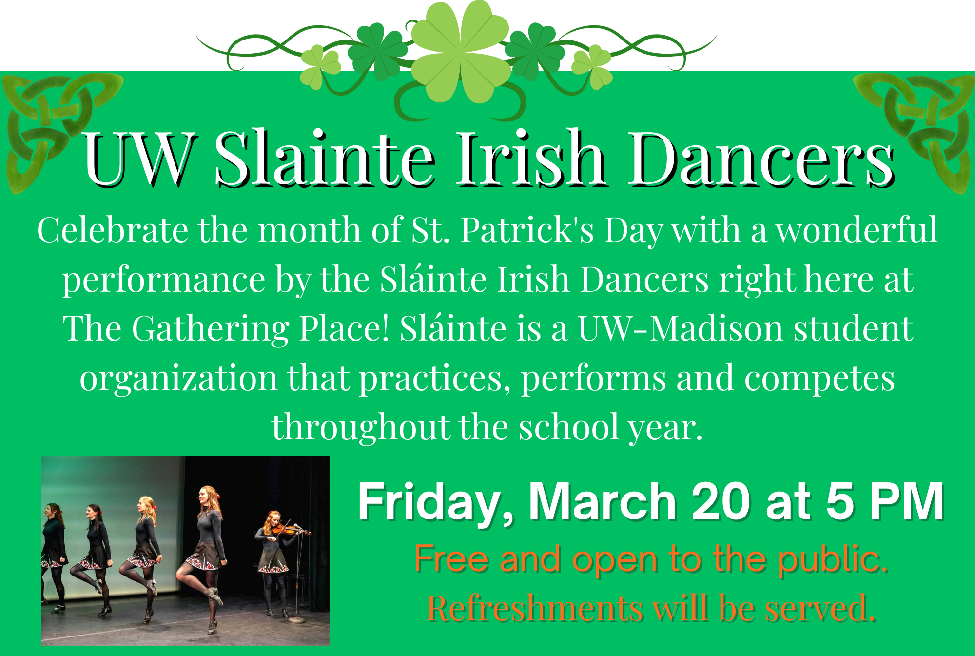 Back to All Events Slainte Irish Dancers Friday, March 20, 2026 5:00 PM 6:00 PM The Gathering Place 715 Campus Street Milton, WI, 53563 United States (map) Google Calendar ICS